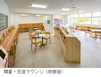 このプロジェクトは、学校法人大多和学園 開星中学校・高等学校の食堂および生徒ラウンジについて、開星の中高生および島根大学生(総合理工学部・自然科学研究科の井上研究室)が協働で設計提案・改修を行なったものです。